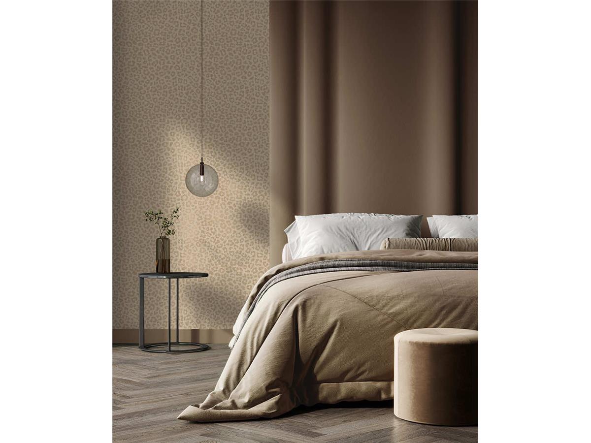 • An allover textured wallcovering enriched with metallic leopard spots that cascade across a raised acrylic base. The combination of shimmering pattern and tactile depth creates a bold yet elegant contemporary statement wall.